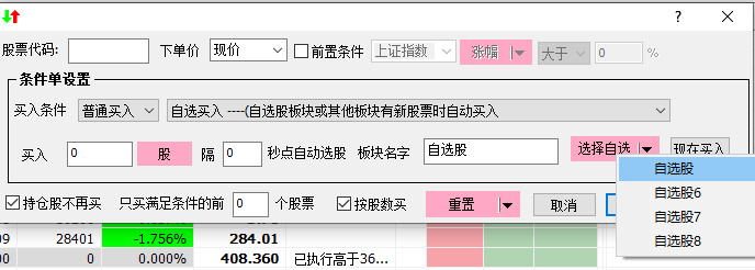 点击 选择自选 按钮(左侧),可以选择当前的自选板块,例如自选股,自选1等(大智慧,飞狐)。注意假如行情软件是通达信,自选股以拼音代码显示,如 ZXG,ZXG1等等。点 确定 后,就建立了自选股条件单。自选股买入的条件,要注意一下说明: