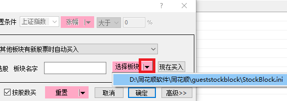 如果是同花顺,需要 先点击 选择自选 按钮右侧的 下拉箭头,先设置好同花顺 StockBlock.ini 的路径。指定同花顺StockBlock.ini文件的路径和自定义板块名称,StockBlock.ini是同花顺个人自建板块的文件,一般如果你是用户登录的,位于同花顺目录下面对应的用户名的子目录。如果是guest登录即不是注册用户登录,则位于同花顺目录下面的gueststockblock子目录。然后点击 选择自选 按钮左侧 ,就可以选择同花顺的板块.
