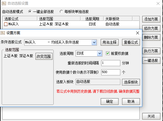 2.设置 自动选股器使用的指标,这里例子是 MA,选股后的结果放在 自动选股 板块里,文件名为拼音 ZDXG,你也可以选其他板块名字。