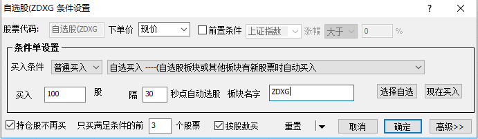 3.助手里建立一个 自选股 买入条件单,板块名字就是 上面第二步的 ZDXG 即板块拼音缩写大写,并设置助手每隔多少秒自动点 自动选股。这就可以了,助手会定时运行通达信自动选股,有新股票就可以自动交易了。注意,你需要每天早上下载好数据。