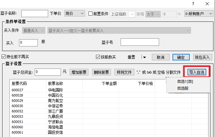 你也 可以 点击 右上角 功能, 再点击 自选股(篮子)买入 , 如下图,再 点 导入自选,就可以导入自选里的股票。这种方式优点是可以单独指定每个股票的买入数量等。