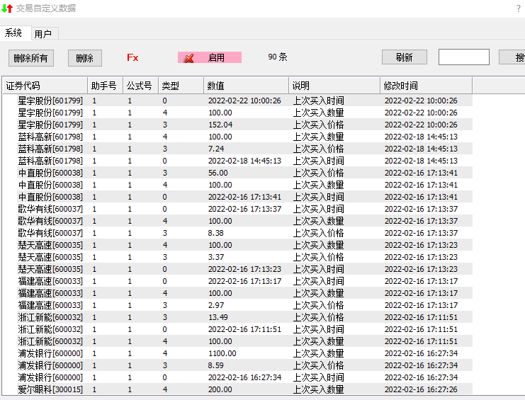 注意:系统定义数据需要勾选 启用 按钮 才会记录和访问。数据如果需要修改或删除需先关闭行情软件,删除修改完需要重启助手才能正常工作.