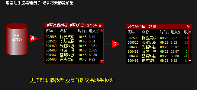 这个例子需要一个全推的大智慧,并有股票池功能。我们用一个股票池,每天运行,记录每天的集合竞价。此股票池可在助手大智慧股票池例子目录里面找到.