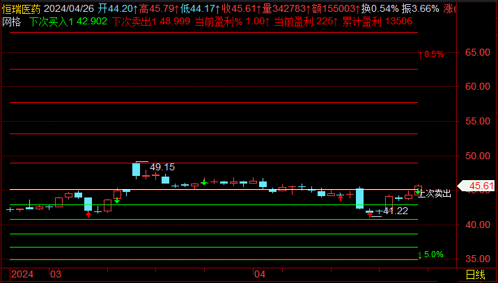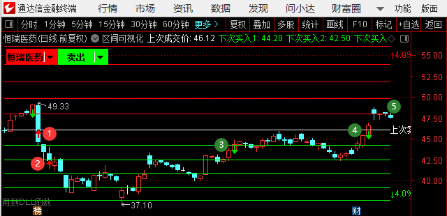助手的区间交易(网格交易)策略比一般券商自带的网格交易策略的强大之处,除了以上说的网格匹配,网格训练外,还包括区间(网格)可视化。也就是把网格策略的设置参数,历史买入卖出点,当前盈利情况等通过指标显示在大智慧,通达信,交易师,易得,金字塔等股票分析软件的图形上。
