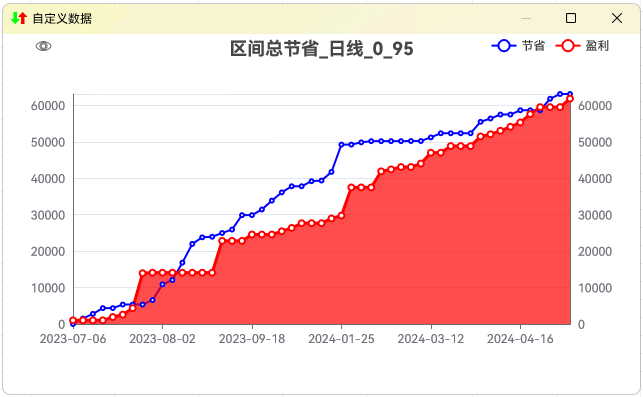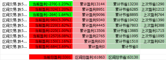 蓝色线表示区间总节省,红色表示区间总盈利,可以看出蓝线始终在红线上面,说明这段时间市场总体还是震荡下行为主,但总的来说买卖还是比较均衡