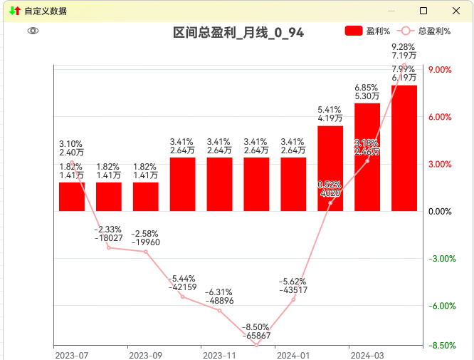 淡红的线表示整个账号的盈利,深红线表示区间总盈利,注意红色柱子的区间走高盈利是累计的,即后面一月的会包含前面的所有。可以看出中间几个月一直没变化,那是因为一直处于买入或账号无可用资金状态(如果资金管理策略提高可能会会更好),而且没有卖出机会。