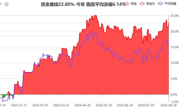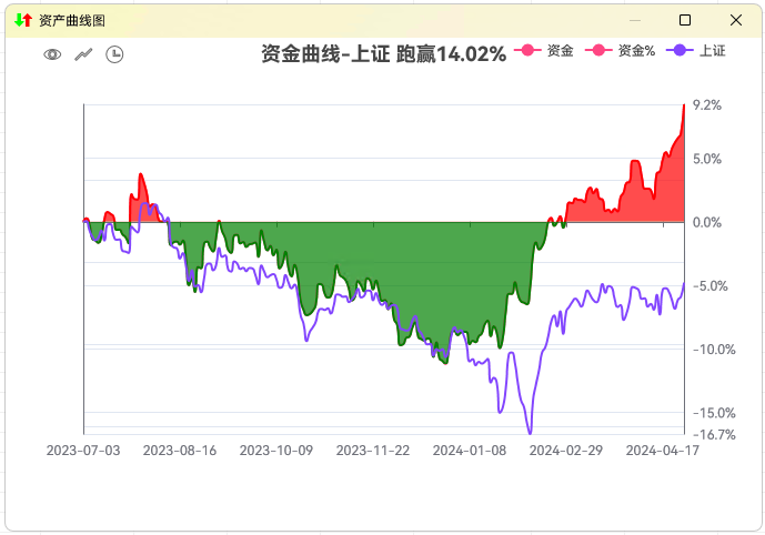 你可以通过助手的内置资金曲线和参与区间交易的股票的平均涨幅来衡量区间交易是否有效,并以此来调整区间的选股和设置。一般来说,我们要努力让资金曲线跑赢大盘和参与区间交易的平均涨幅。以下是一个例子账号。