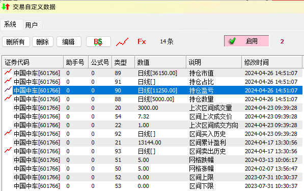 5.回到助手,设置合适的上次成交价。你也可以不设置,直接删除助手自定义数据中此股票的自定义数据,助手训练模式需要这些自定义数据配合。如果你重新训练,也应该删除相关的自定义数据,也应该删除相关的下单记录。或者直接点击 练 字,会同时删除此条件的下单记录和自定义数据,更方便。 ![]()