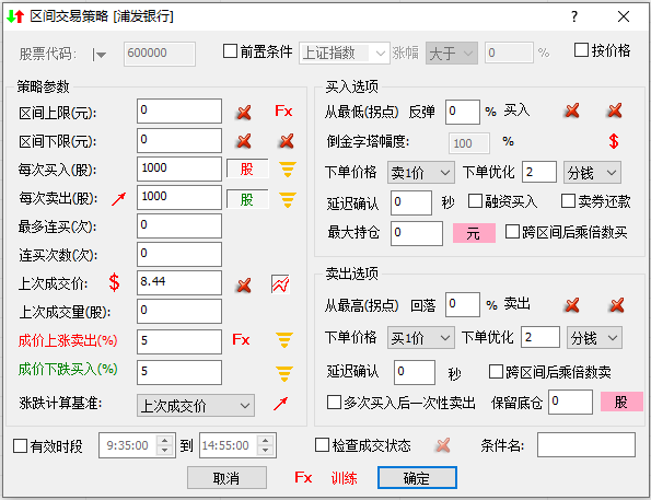 区间下限 可选,默认0表示不设下限,如设了价格,当股价低于此价格时自动卖出此股票的所有持仓,此后只要股票一直低于下限,区间交易策略也会停止交易。因为此时很可能进入了明显下跌趋势,控制风险。