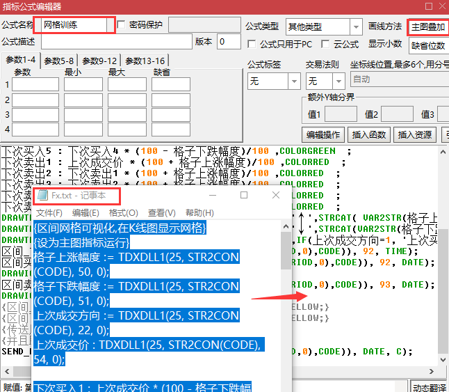 2.把记事本 Fx.txt 里的代码复制到通达信新建一个主图公式里面,随便起个名字,保存为比如 网格训练 ,记得设置为主图叠加公式。