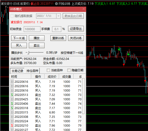 4.设置 训练模式 的参数,设置好资金,选好训练开始时间,记下训练开始的 价格,用于后面设置区间的上次成交价。