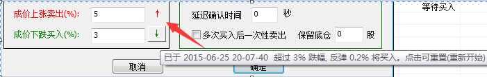 成价下跌买入(%) 必选 ,当股价和上一次成交价相比,跌幅超过这个设置,将执行买入操作;如果右边卖出选项设置了低点(拐点)反弹幅度,则要等到反弹达到条件才会买入。这可以防止单边下跌就过早买入。